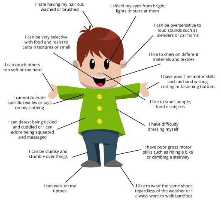 Некоторые проблемы в поведении связаны с тем, что люди с РАС воспринимают и перерабатывают сенсорную информацию иначе. У большинства детей с РАС обнаруживается целый ряд особенностей в сенсорной сфере. Поэтому для создания гармоничных условий среды каждый раз необходимо исследовать сенсорную сферу ребенка и опираться именно на его индивидуальные особенности. При наличии у ребенка значимых сенсорных нарушений часто бывает необходима консультация специалиста, который поможет понять проблемное поведение, связанное с необычной сенсорной чувствительностью, и поможет создать комфортную обстановку для ребенка, убрав все непереносимые раздражители.