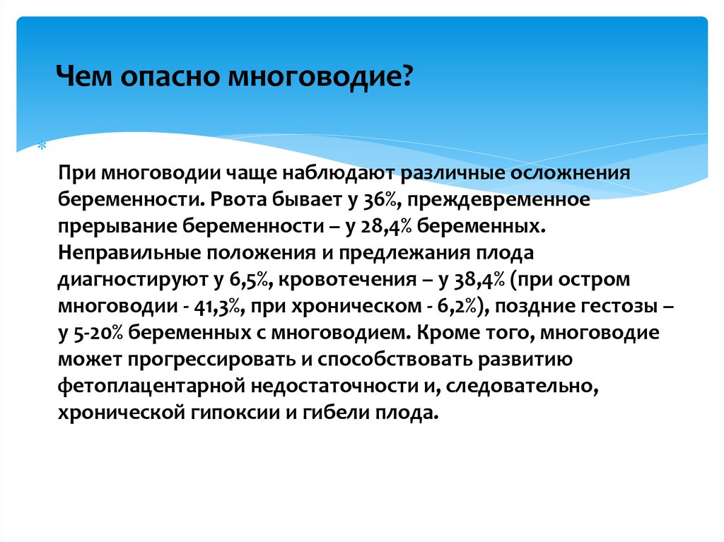 Многоводие может привести к преждевременным родам и неправильному положению плода. Поэтому лечение здесь также важно, как и при маловодии.
