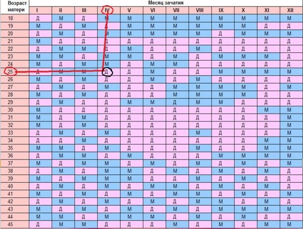Нужно взять возраст матери и сложить его с месяцем зачатия. Получится двухзначное число. Потом нужно между собой сложить эти цифры. Нечетное — мальчик, четное — девочка. Например женщине 28 лет и она забеременела в феврале. Значит, 28 + 2 = 30. Далее 3 + 0 = 3. Нечетное. Это я привела свой пример. У меня мальчик :)У 90% процентов женщин на моей работе совпало.