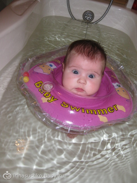 Позже, когда ребенок привыкнет к водным процедурам, идеально подойдет для купания специальный детский надувной круг который одевается на шею малыша и используется в большой ванне, где больше пространства.