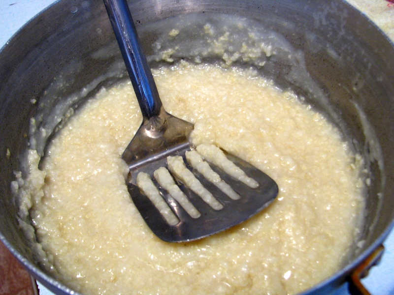 Из двух стаканов муки получается 5–6 порций. Не надо сварить много, на потом. Приготовьте столько, сколько будете есть с одного раза, так как после остывания оно становится твердый как желе.