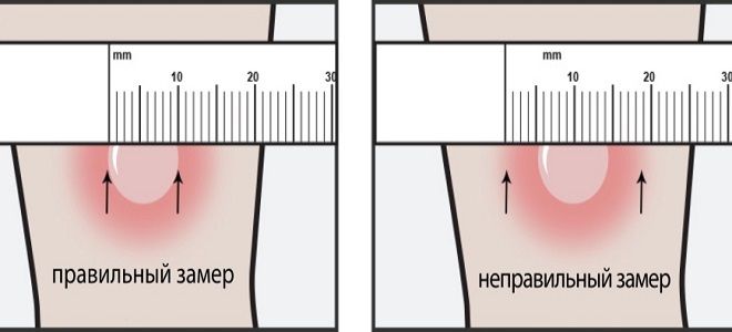 Реакцию следует измерять в миллиметрах уплотнения (твердого вздутия). Читатель не должен измерять эритему (покраснение). Диаметр уплотненной области следует измерять поперек предплечья (перпендикулярно длинной оси).