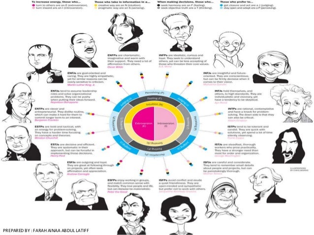 Например, человек, склонный к интроверсии, интуиции, мышлению и суждениям, будет считаться типом личности INTJ. Естественно, в этих четырех спектрах есть 15 других личностных перестановок.