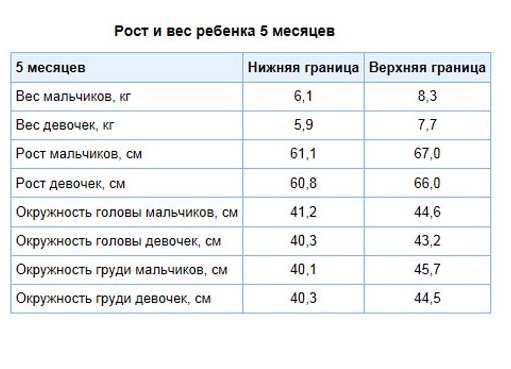 Умножьте на два массу тела вашего крохи при рождении – примерно столько весит теперь пятимесячный малыш. В конце 5 месяца ребенок должен иметь вес 6.5 – 7.5 кг (±1 кг) и рост 63 – 65 см (± 3 см). За этот месяц он набирает до 700 г и прибавляет около 2-х см.