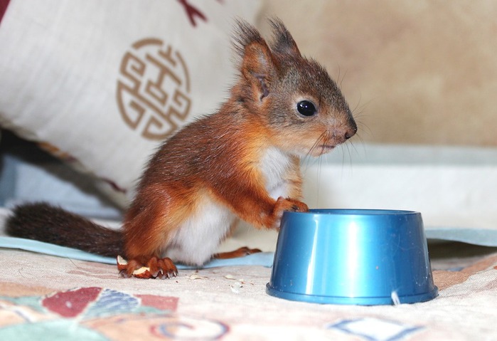 Это отличный выбор животного. Она живет в клетке, однако часто просится, чтобы ее выпустили. Погуляв по дому, она возвращается в клетку, прихватив с собой бумаги или специально оставленные для нее волоски от кукурузы (она обустраивает себе гнездо). Кушает кедровые орешки, яблоки, морковку, семечки) просыпается примерно в 10 утра, выглядывая из гнезда, просит кушать. При постоянных уборках и правильном уходе неприятного запаха не наблюдается. Белка очень ручная, не кусается и любит, когда ее гладят. Когда ей жарко, она ложится во весь рост под напором кондиционера или вентилятора. Не боится людей, однако не любит собак. Пугает их характерными звуками и прыжками. Очень доброжелательна. Тем, кто решил завести домашнюю белочку — вы сделали правильный выбор. Белки — это чудо».