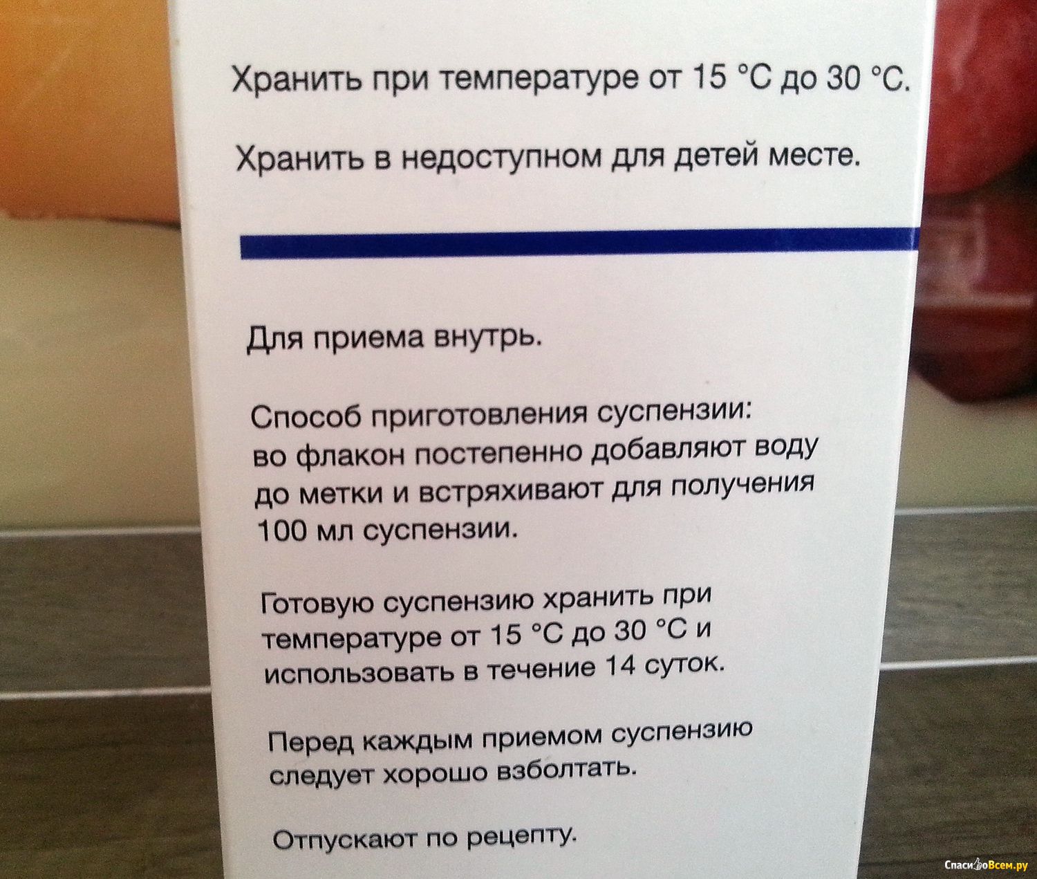 Суспензию необходимо готовить непосредственно перед применением. Как это сделать? Добавьте в бутылочку кипяченую воду до отметки, хорошенько встряхните – и лекарство готово! Хранить его нужно в холодильнике не более 14 дней. Перед каждым применением не забывайте взбалтывать бутылочку.