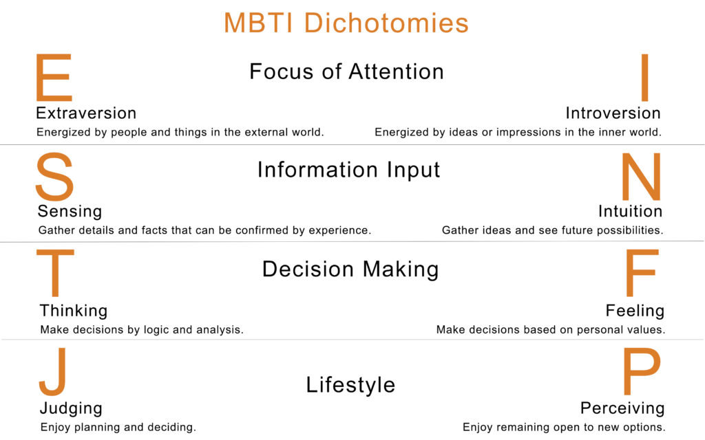 Тест тип личности Майерс Бриггс использует систему дихотомий, чтобы определить наши предпочтения в использовании когнитивных функций. Это как выбор между чаем и кофе — у вас может быть явное предпочтение, или вы можете любить оба напитка, но один чуточку больше.