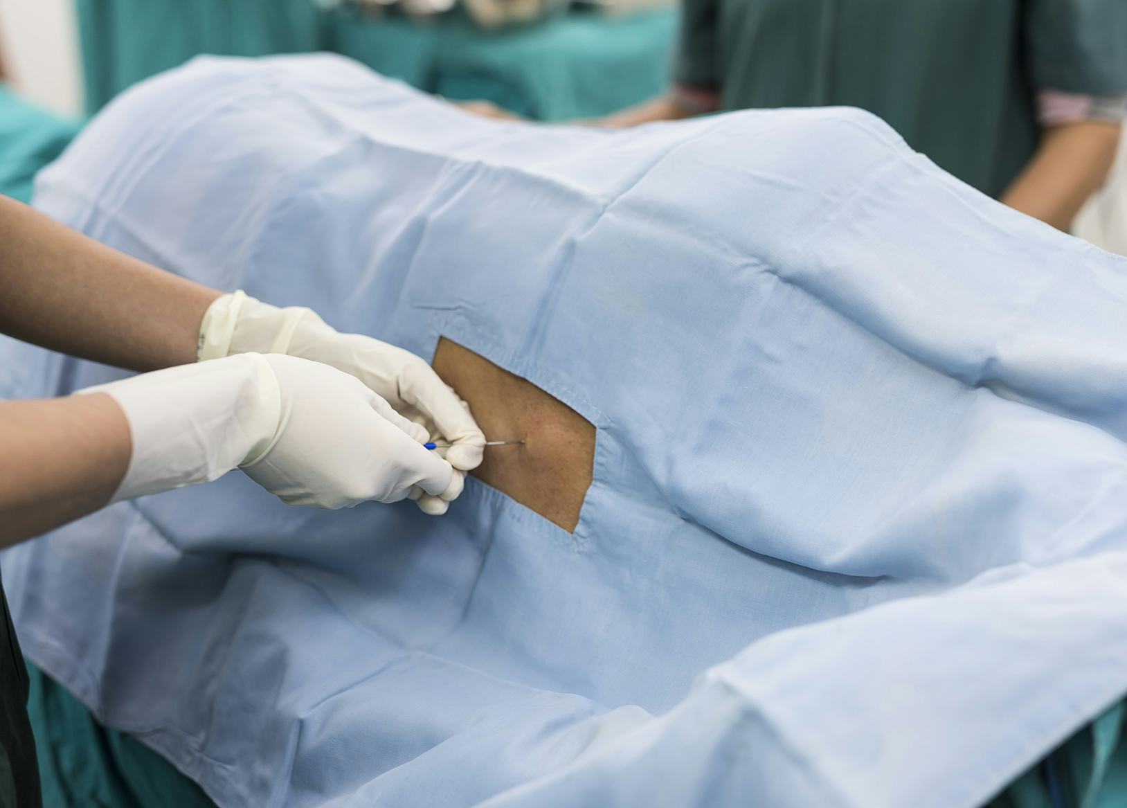 - Антисептический раствор будет использоваться для протирания поясной области средней части спины, чтобы свести к минимуму вероятность заражения. В небольшой участок на спине будет введен местный анестетик, чтобы обезболить его. Затем иглу вводят в онемевшую область вокруг спинного мозга в нижней части спины.